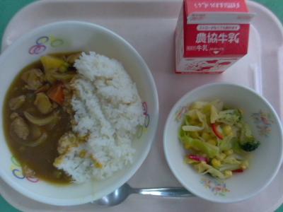 ~(麦飯)、チキンカレー、カラフルサラダ、牛乳~