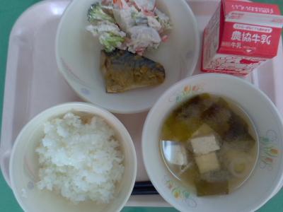 ~ごはん、さばのねぎみそ焼き、れんこんサラダ、とうふのみそ汁、牛乳~