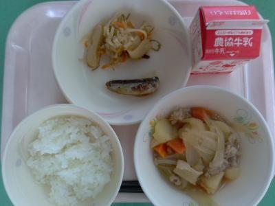 ~ごはん、いわしのみそ煮、切干大根のうま煮、肉じゃが、牛乳~