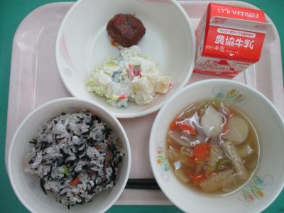 ~ひじきごはん、肉団子のケチャップあん、マセドアンサラダ、のっぺい汁、牛乳~