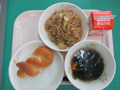 ~米粉パン(減)、焼きそば、わかえとえのきのスープ、牛乳~