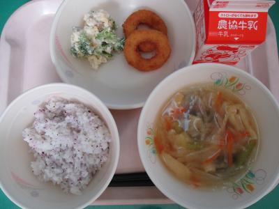 ~しそごはん、イカリング、記憶力アップサラダ、みそ汁、牛乳~