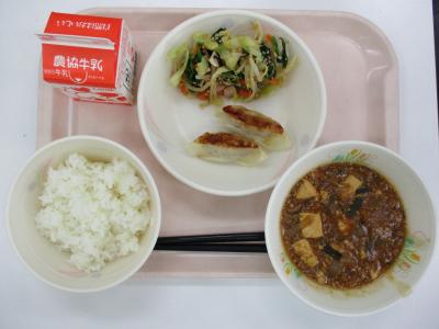 ~ごはん、焼きギョウザ、野菜のナムル、マーボー豆腐、牛乳~