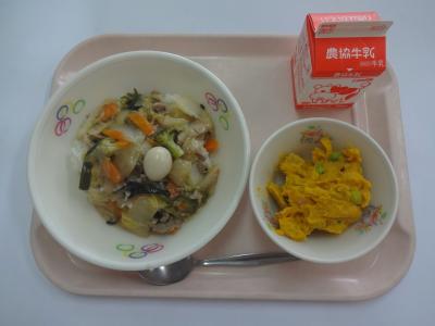 ~(麦飯)、中華飯、かぼちゃサラダ、牛乳~