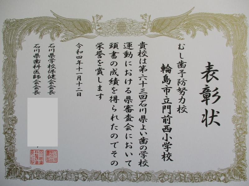 この何気ない学校生活ですが、その積み重ねによって、 様々評価されています。 11月12日に「よい歯の学校運動」努力賞を受賞しました。 |