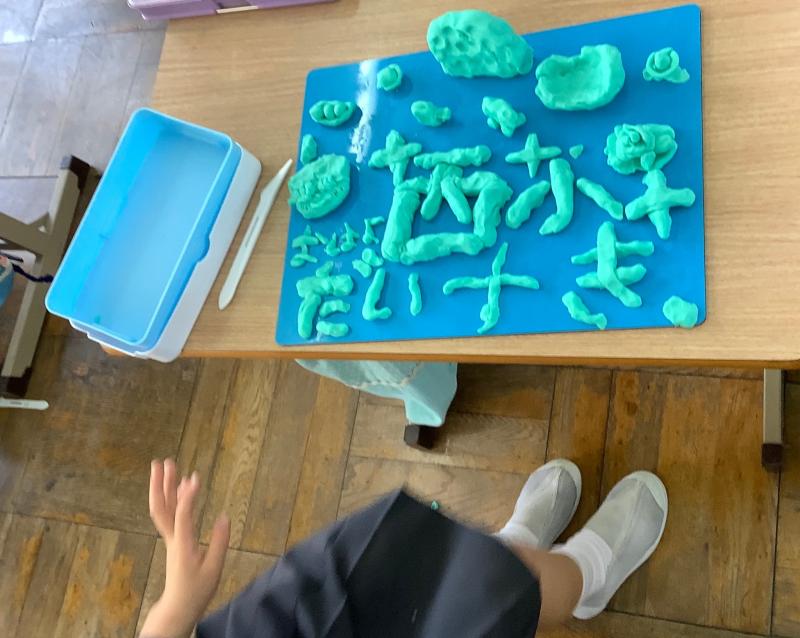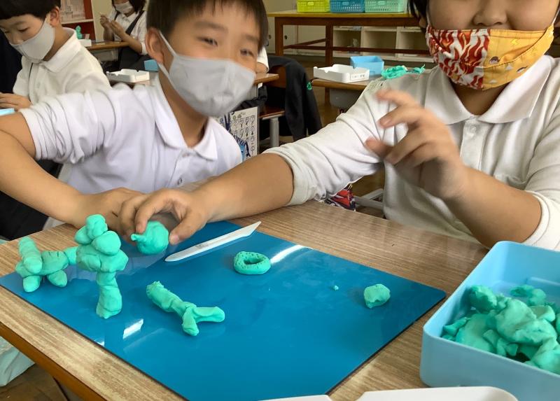 | 2年生、今日は図工で粘土遊び。楽しそうでホッ。 | おもしろそうに次々つくりだしホッと(hot)に。 |
