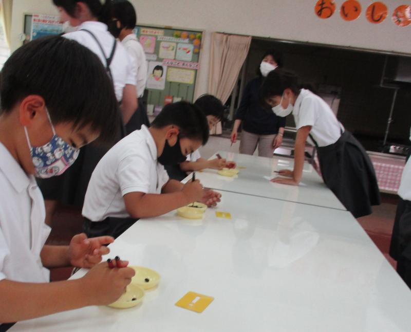 | 高学年が企画した箸による豆つかみ大会。今日は1年生が挑戦。 | |