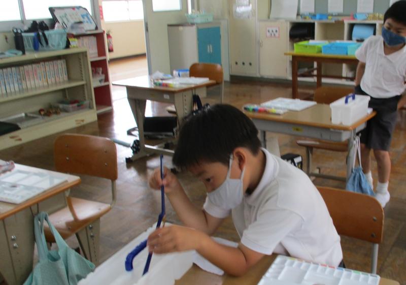 | 2年生、今から水彩絵の具。水を汲んだ様子は、涼しげです。でも、水道から運ぶことが・・・。 | |