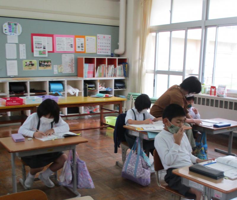 | 算数やアルファベット、漢字等、どのクラスも静かに練習に取り組んでいます。 | |