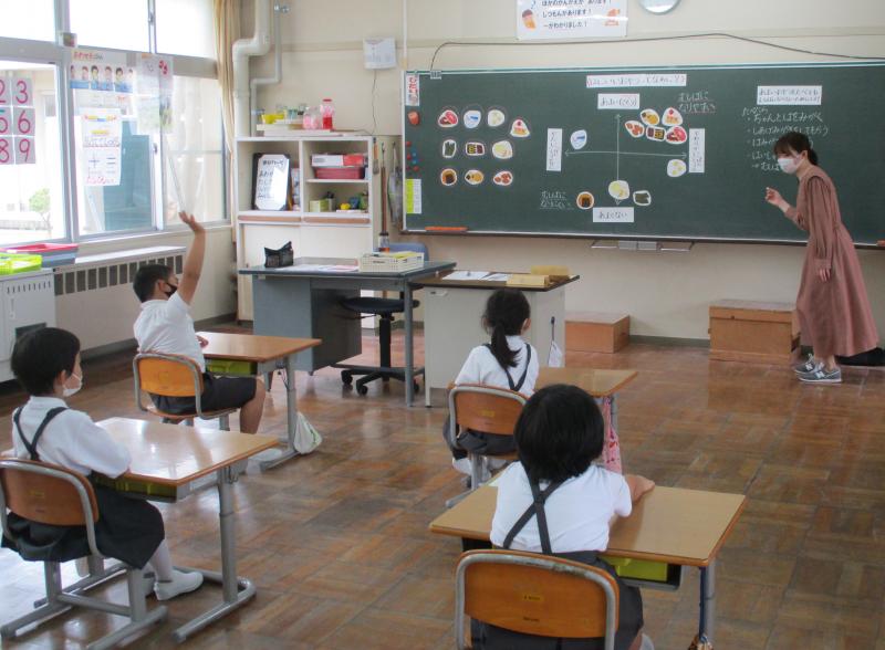| 1年生、養護教諭と担任で虫歯予防の授業をしました。8020目指しましょう。 | |