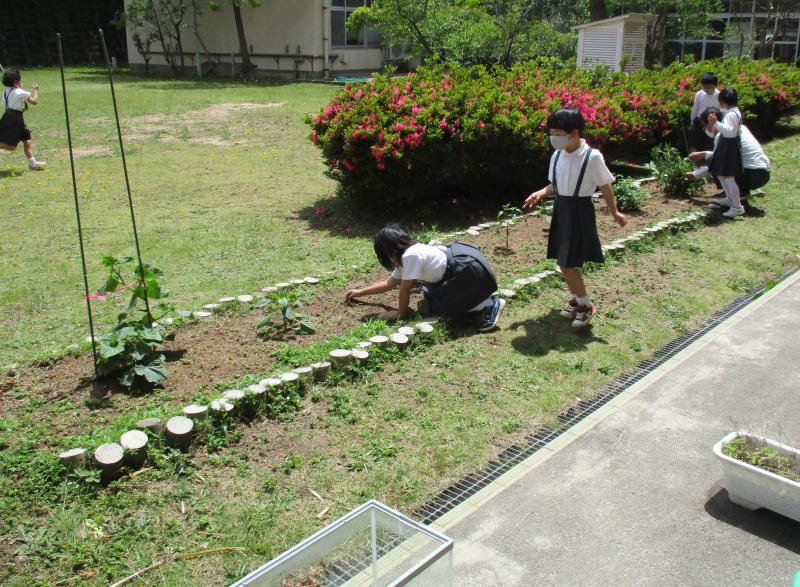 | 1・2年生、昼休み、つかの間の晴れを利用して、中庭で楽しんでいます。 | |
