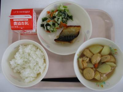~ごはん、さばの西京焼き、ほうれん草の和え物、たけのこの炊き合わせ、牛乳~