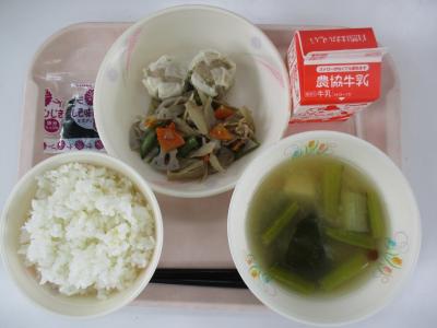 ~ごはん、しそ味ひじき、肉しゅうまい、五目きんぴら、なめこのみそ汁、牛乳~