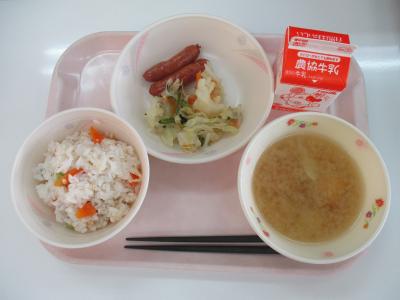 ~まぜごはん、ウインナーのケチャップがけ、もやしとキャベツの和え物、みそ汁、牛乳~