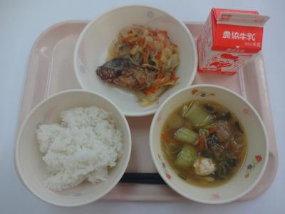 ~ごはん、揚げさばと野菜あんかけ、春雨と肉団子のスープ、牛乳~