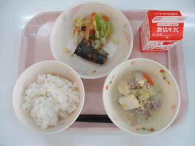 ~ごはん、さばみそ煮、ちくわとキャベツの和え物、豚肉の豆乳仕立て、牛乳~