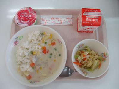 ~(麦飯)、シチューライス、野菜のナムル、牛乳、さくらんぼゼリー~