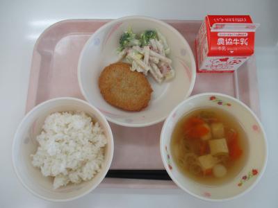 ~ごはん、コロッケ、マカロニサラダ、とうふのすまし汁、牛乳~