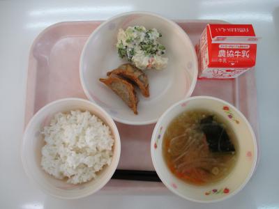 ~ごはん、揚げギョウザ、ポテトサラダ、厚揚げのみそ汁、牛乳~