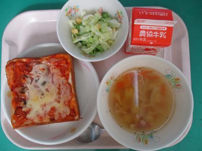 ~ピザトースト、グリーンサラダ、マカロニのコンソメスープ、牛乳~