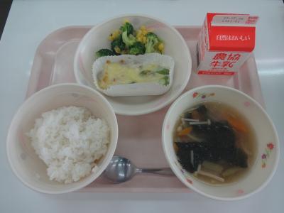 ~ごはん、アスパラグラタン、添え野菜、ミートボールの春雨スープ、牛乳~