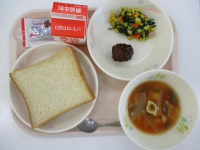~食パン/いちごジャム、ミートボール、ほうれん草とコーンのソテー、トマトスープ、牛乳~