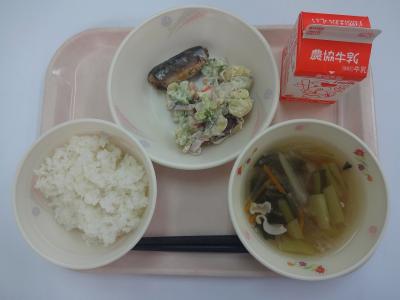 ~ごはん、いわしのみそ煮、さつまいもサラダ、沢煮椀、牛乳~