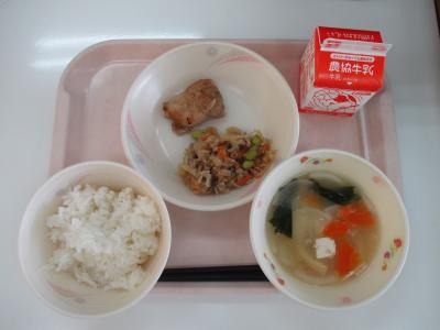 ~ごはん、てりやきチキン、切り干し大根のそぼろ炒め、具だくさん汁、牛乳~