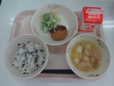 ~わかめごはん、メンチカツ、グリーンサラダ、とうふのみそ汁、牛乳~