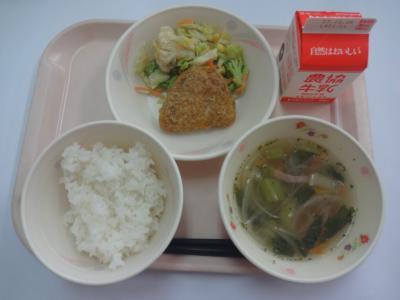~ごはん、かぼちゃコロッケ、カラフルサラダ、春雨のスープ、牛乳~