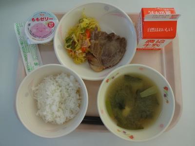 ~ごはん、豚肉のしょうが焼き、そうめん南瓜の炒め物、青菜と豆腐のみそ汁、牛乳、ももゼリー~