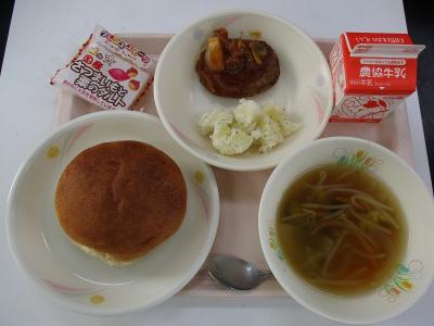 ~胚芽バンズ、デミグラスハンバーグ、粉ふきいも、もやしのスープ、牛乳、タルト~