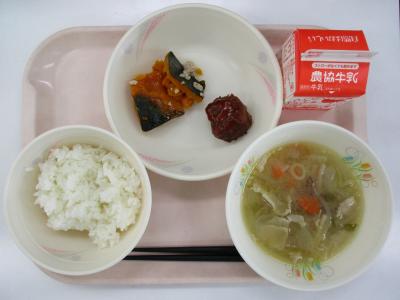 ~ごはん、さばみそ煮、キャベツのごま和え、肉じゃが、牛乳~