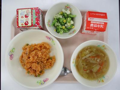~チキンライス、グリーンサラダ、野菜スープ、牛乳、クリスマスケーキ~