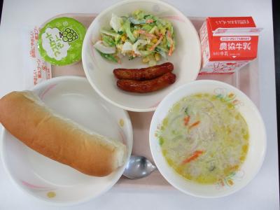~コッペパン、ウインナー、キャベツとコーンのサラダ、クリームスープ、牛乳、マスカットゼリー~