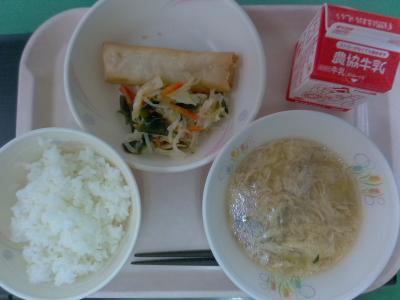 ~ごはん、春巻き、野菜と海藻のナムル、かきたまスープ、牛乳~