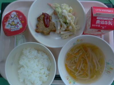 ~ごはん、もみの木ハンバーグ、マカロニサラダ、もやしのスープ、牛乳、クリスマスカップデザート~