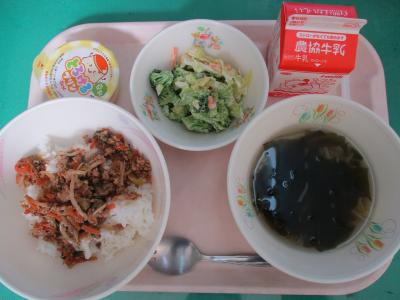 ~(麦飯)、野菜たっぷり肉みそ丼、ブロッコリーのごまマヨ和え、わかめスープ、牛乳、豆乳プリン~
