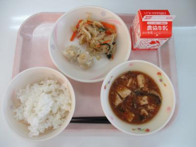 ~ごはん、コーンしゅうまい、野菜のナムル、マーボー豆腐、牛乳~
