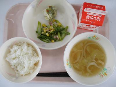 ~ごはん、野菜しゅうまい、アスパラベーコン、みそ汁、牛乳、クリームコンフェ~