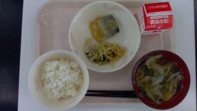 ~ごはん、さばみそ煮、切り干し大根と小松菜の炒め煮、具だくさんみそ汁、牛乳~