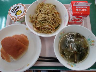 ~バターロール(減)、焼きそば、野菜スープ、牛乳、プリン~