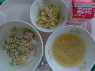 ~(麦飯)、魚とたまごのそぼろ丼、野菜の和え物、みそ汁、牛乳~