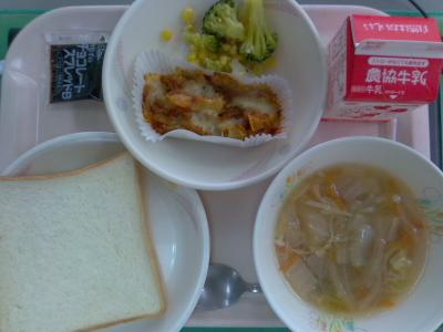 ~食パン、チョコクリーム、ラザニア風グラタン、添え野菜、ミートボールの春雨スープ、牛乳~