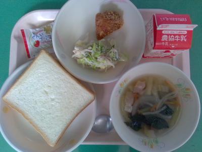 ~ミルク食パン、ジャム、鶏のからあげ、大根とツナのサラダ、野菜スープ、牛乳~