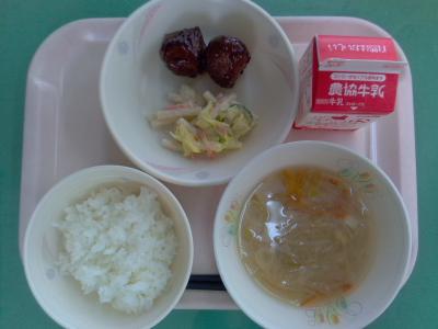 ~ごはん、肉団子、マカロニサラダ、具だくさんみそ汁、牛乳~