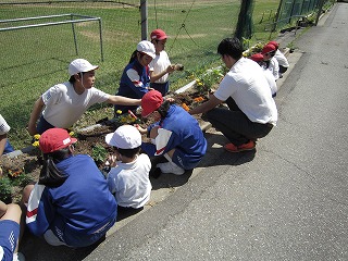 低学年が学校下の畑において、さつまいもの苗植えを行いました。小学生だけでなく、保育所の子どもたちも一緒に参加しました。さつまいもはそっと寝かして、優しく土をかけてあげることがポイントです。みんな水やりや藁かけなど一生懸命がんばりました。秋にはおいしいさつまいもが食べられるといいね。
