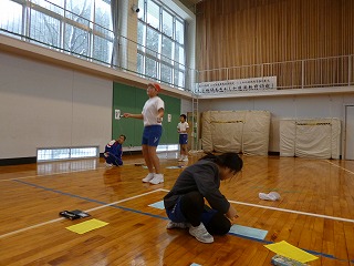 担当の先生から投げ方を教わったあと、低学年と高学年に分かれて投げてみました。