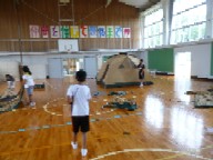 当日は,天候が心配されたため運動場でのテント設営をやめて体育館で,テントを設営しました。