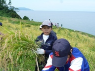 台風等の影響で延期されていた稲刈りを今日行いました。堂前さん・田中さん・出口さん・南さんに教えてもらいながらやりました。6年生は,昨年に引き続きなので慣れたものです。5年生は,はじめて人もいましたがみんな無事にできました。